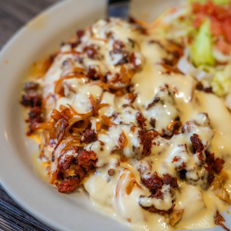 Grilled chicken or steak with onions, bell peppers, and tomatoes, served on tortilla chips, topped with cheese sauce.