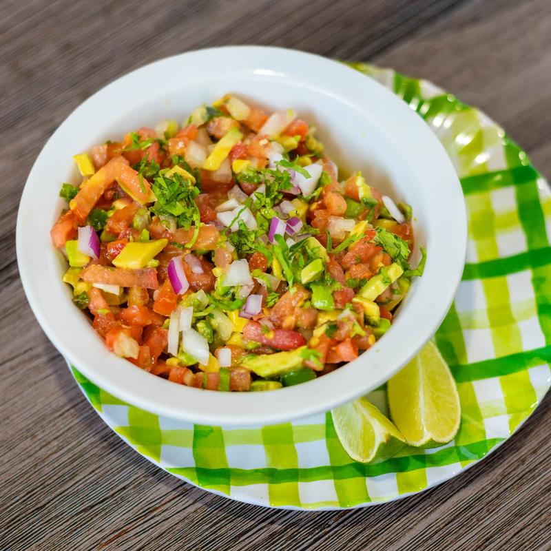 Fresh avocado chunks mixed with diced tomatoes, onions, and cilantro.